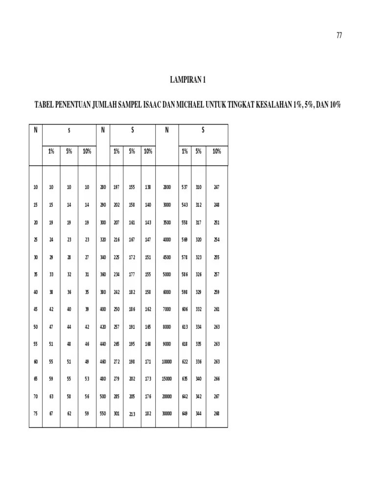 Tabel penentuan jumlah sampel isaac dan michael untuk. Tingkat kesalahan 1%, 5%, dan 10%. Bisa pakai formula atau pakai tabelnya. Dari tabel di atas diketahui, bahwa penentuan jumlah sampel dari rumus. • isaac and michael, smith.